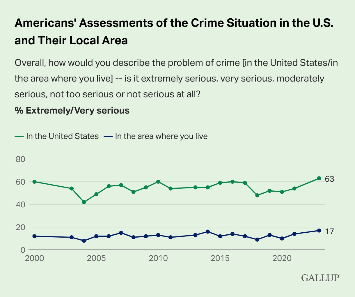 Gallup polled this issue last November and found 63% of Americans see crime as a serious issue with 28% reporting their household being victimized.