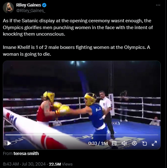 In a separate post, Gaines included video of Khelif beating on a female Mexican boxer.