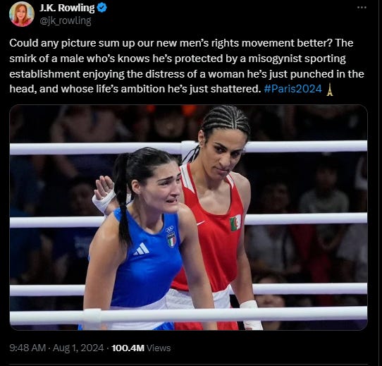 Harry Potter author J.K. Rowling’s X post on that match has gone viral, garnering over 100 million views as of Aug. 2, 2024.