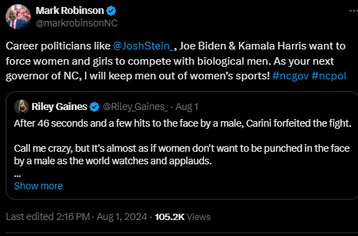 Robinson’s X post builds on a post issued by Riley Gaines, the All-American swimmer who has become a major figure in pushing back on men being allowed to complete in women’s sports by identifying as “transgender.”