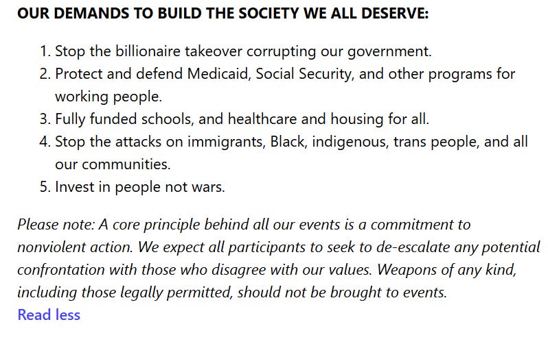 The Raleigh event description comes with a list of demands and a note expressing the movement is “committed to nonviolent action.”