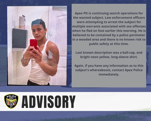 We are continuing search operations for the wanted subject. Law enforcement officers were attempting to arrest the subject for multiple warrants associated with sex offenses when he fled on foot earlier this morning. He is believed to be contained by a police perimeter in a wooded area and there is no known risk to public safety at this time. Again, if you have any information as to this subject's whereabouts, contact Apex Police immediately.