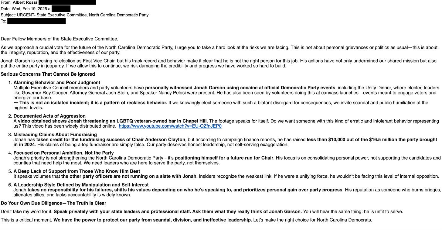 That bid came with concerns from fellow Democrats like Durham Sen. Sophia Chitlik about his past alleged behavior stemming from anonymous complaints in an email last year (below) of past cocaine use at the Democratic Party’s annual Unity Dinner, as well as getting "handsy," with women.