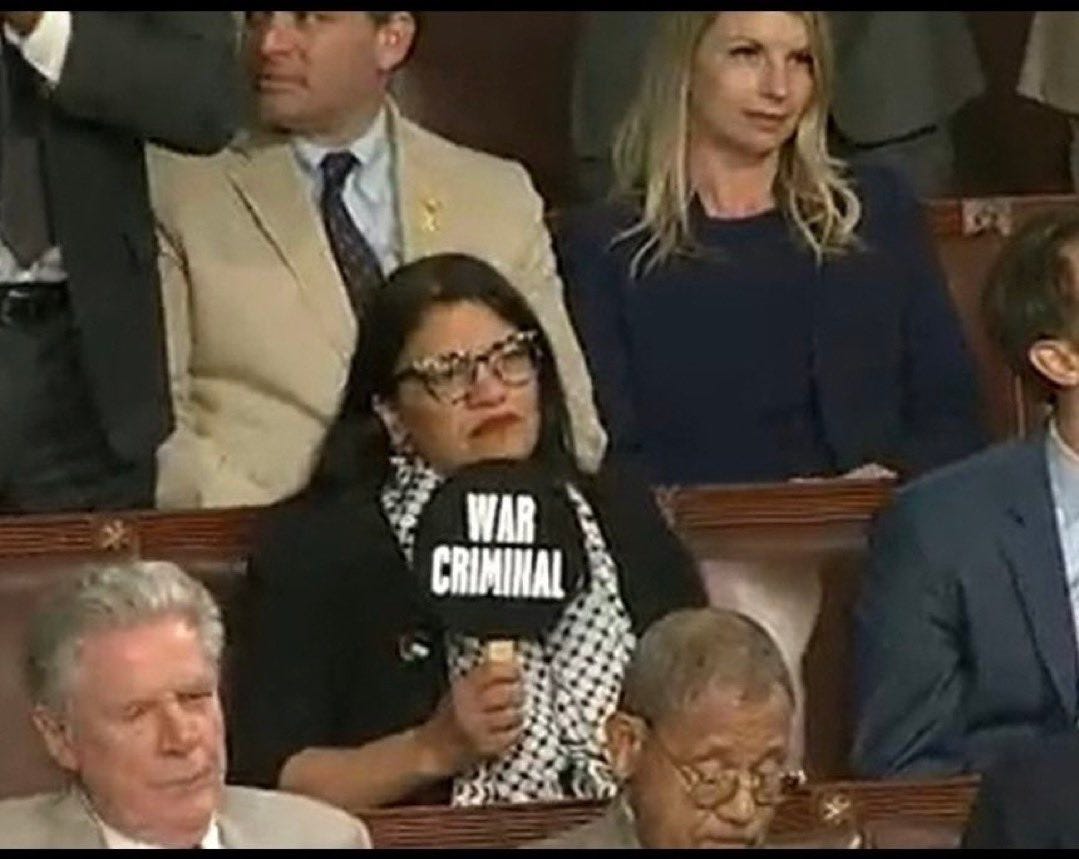 Squad Member Rep. Rashida Tlaib (D-MI-12) attended, holding up a sign that read, “War Criminal” as Netanyahu spoke.