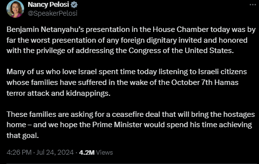 That is why I chose to not attend the Prime Minister's address to Congress today. It is imperative that we are actively working towards a bilateral ceasefire and lasting peace that ensures the release of the remaining hostages, alleviates the dire humanitarian crisis in Gaza, and achieves the ultimate goal of a just and viable two-state solution."