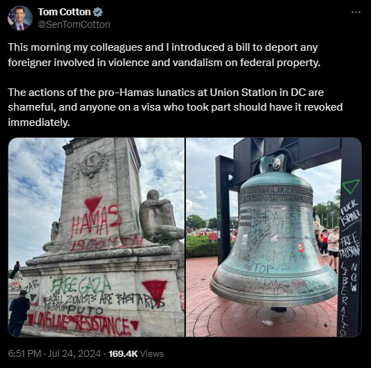 Sen. Tom Cotton posted images of the devastation to X, stating a bill has been introduced to deport foreigners engaged in such activities.
