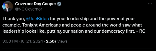 NC Governor Roy Cooper issued a post on X following Biden’s 11 minute speech.