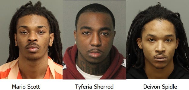 Indicted on multiple charges are Mario Scott, also known as "Homicide" or "Homi," age 21; Tyferia Shakur Sherrod, also known as "2 Wop" or "Wop," age 23; Donta Lamont Bush Jr., "Gonzo" or "Zo," age 24; Hasheem Langston, also known as "Tek," age 23; Quest Jaquan Davis, also known as "Tek," age 29; and Deivon Jalil Spidle, also known as "BDay," age 22.