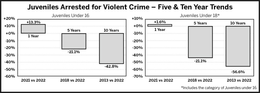 Trends for violent crimes committed by juveniles under 16 and under 18 both show increases between 2021 and 2022; 13.3% and 1.6%, respectively.